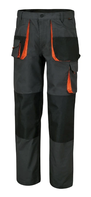 ? Wstawki wzmacniające i kieszenie na nakolanniki wykonane z poliestru typu ?Oksford?/poliuretanu 220g/m2 ? Rozporek zapinany na metalowy zamek ? Dwie przednie kieszenie o regulowanej wielkości, kieszeń z przedziałkami na małe narzędzia i kieszeń na telefon komórkowy z zapięciem na rzep ? Lewa kieszeń o regulowanej wielkości z zapięciem na rzep ? Tylne kieszenie o regulowanej wielkości ze wstawkami wzmacniającymi ?Oksford? i patkami zapinanymi na rzepy ? Uchwyt na młotek i kieszeń na przymiar ? Kieszenie na nakolanniki.