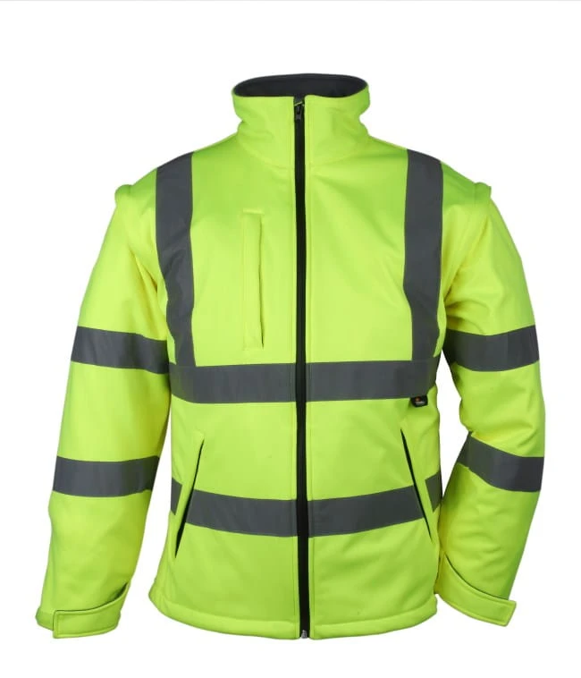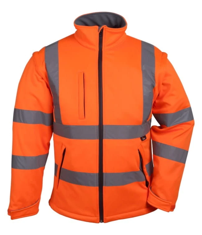 KURTKA OSTRZEGAWCZA SOFTSHELL O INTENSYWNEJ WIDZIALNOŚCI Z ODPINANYMI RĘKAWAMI POMARAŃCZOWA LUB ŻÓŁTA VWJK176