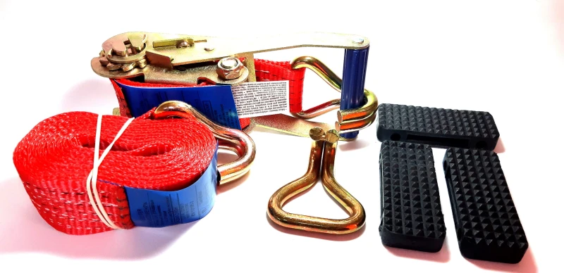 Pas zabezpieczający pojazd transportowany na lawecie poprzez unieruchomienie koła. Bardzo prosty w użyciu. Widoczny zestaw przeznaczony jest do zabezpieczenia jednego koła.